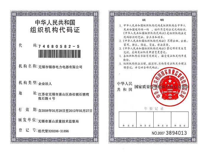 Organization code certificate release time:2020-07-20 04:35:16source:Wuxi Xirong Electric Appliance Co., Ltd.Click:2015